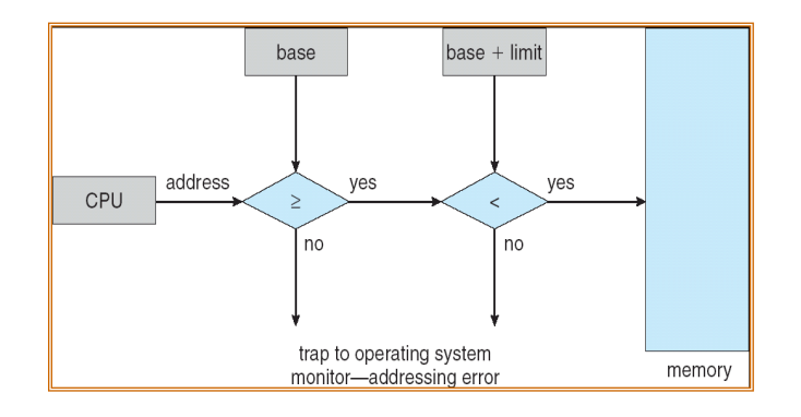 이 경우 cpu에 주소가 들어 왔을때 하드웨어는 각 주소가 사용자가 접근할 수 있는 메모리 범위 내에 있는지 확인하며. 범위 밖일 경우 다른 메모리로의 접근이 감지된것으로 판단해 trap을 발생시킨다.